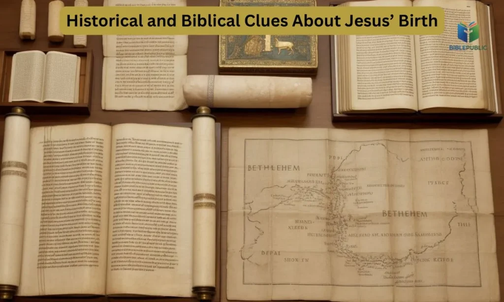 Ancient Biblical scrolls and Bethlehem map showing historical clues about Jesus’ birth.